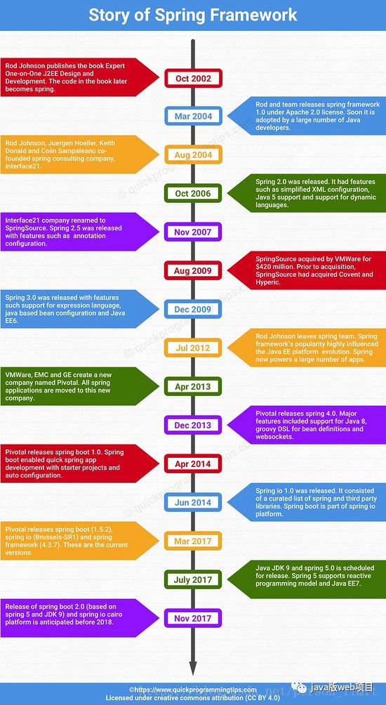 200 年 6 月,Spring 2.0 在 Apache 2.0 许可下发布。2004 年 3 月,1.0 版发布。有趣的是,在1.0发布之前,spring 就被开发人员广泛采用。2004 年 8 月,Rod Johnson,Juergen Hoeller,Keith Donald 和Colin Sampaleanu 共同创立了一家专注于 Spring 咨询,培训和支持的公司 interface21。