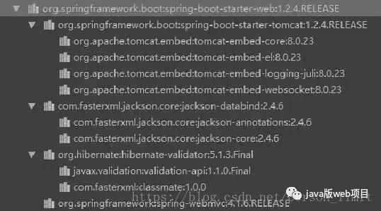 Spring 提供了一系列的starter pom 来简化Maven 的依赖加载,例如,当你使用了spring-boot-starter-web 时,会自动加入如下图所示的依赖包。