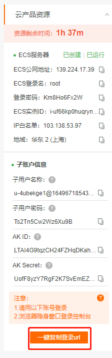 这样,我们就拥有了一个属于自己的ecs服务器!选择一键复制url,新建一个无痕窗口(避免与你当前登录的账号冲突),粘贴网站,登录提供的账号。