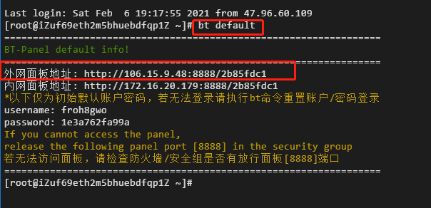 登录成功后输入命令bt default,获取宝塔登录界面
