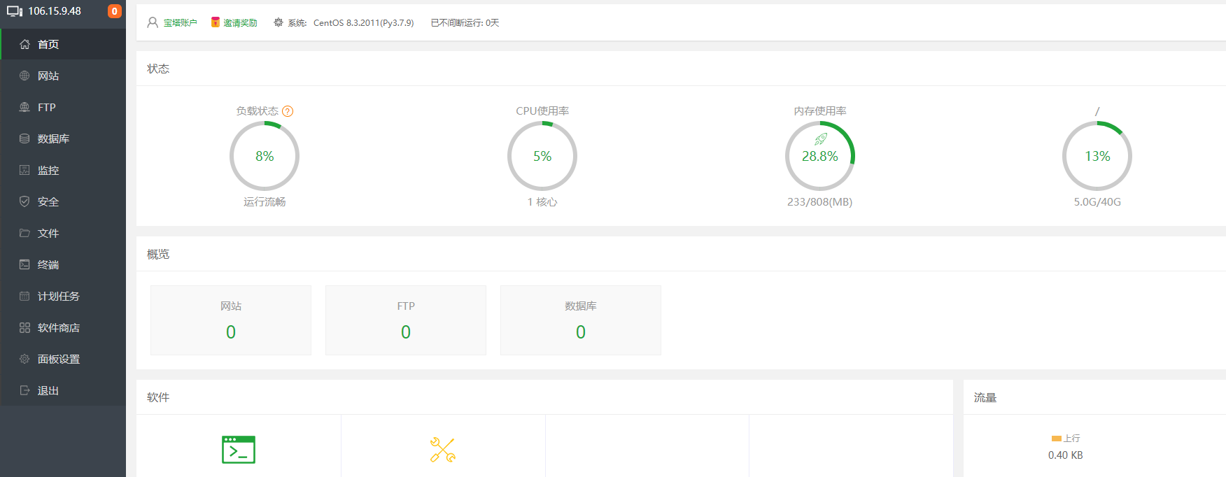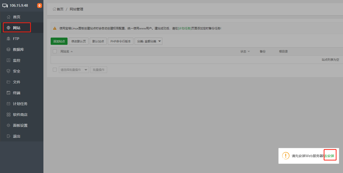 这下我们就成功进入到了宝塔管理页面,可以开始部署我们的网站了。