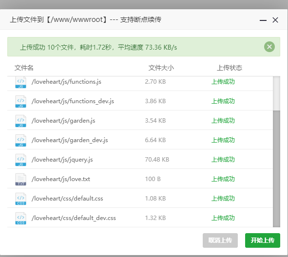 上传我们已经保存好的网站代码目录,这里我们选择上传loveheart。