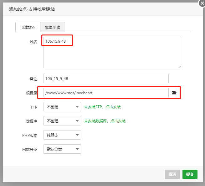 选择添加站点。域名输入自己申请的服务器的公网ip。例如本处是106.15.9.48。根目录选择你刚才上传的源代码文件夹。