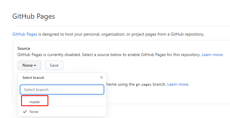 拉到最下面,找到GitHub Pages。选择master分支,点击Save保存。