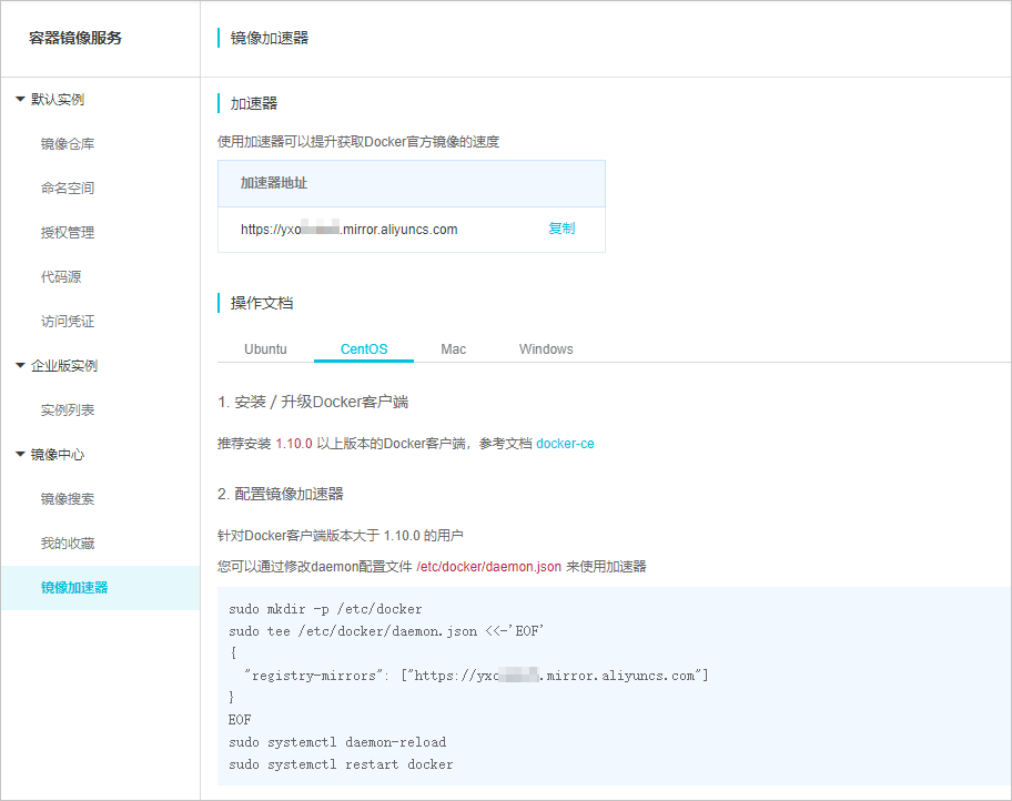 - 单击【镜像中心】 > 【镜像加速器】,可以看到阿里云为您提供了一个专属的镜像加速地址。