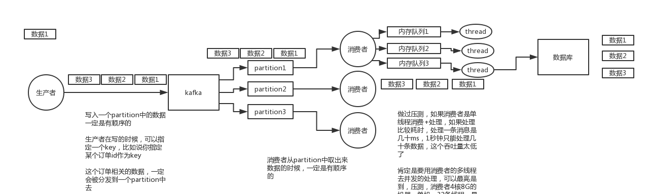 一个topic,一个partition,一个consumer,内部单线程消费,写N个内存queue,然后N个线程分别消费一个内存queue即可
