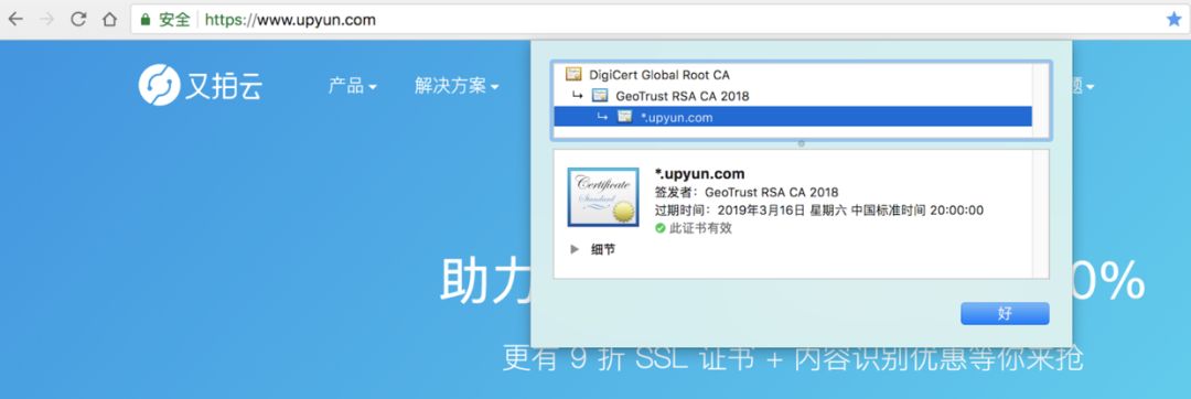 上文为又拍云官网,我们可以通过点击浏览器地址栏锁标志来查看网站认证之后的真实信息,SSL证书保证了网站的唯一性与真实性。