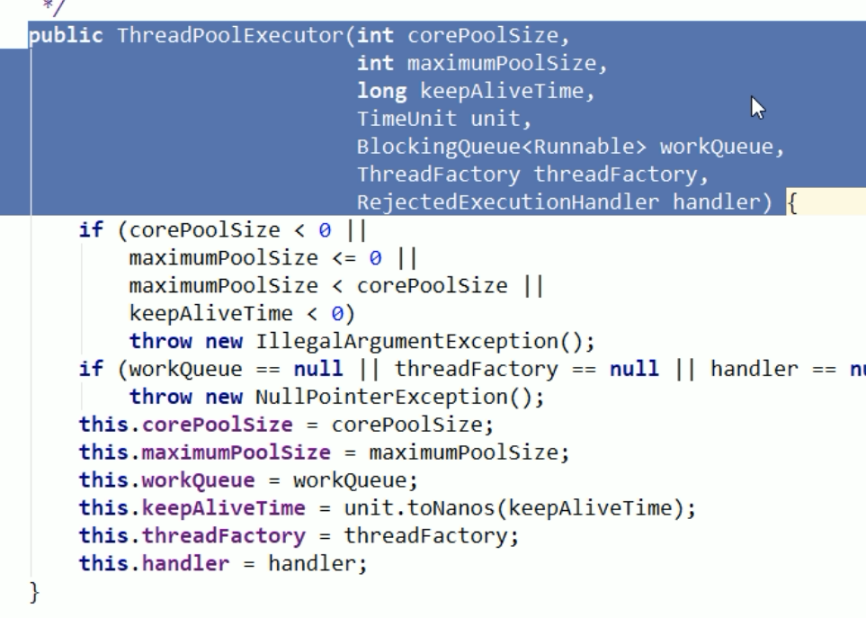 - 如果正在运行的线程数量大于或等于corePoolSize,那么将这个任务放入队列