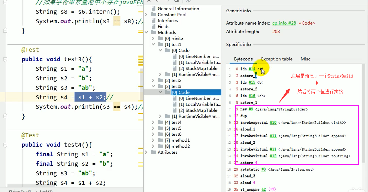 - 常量与常量的拼接结果在常量池,原理是编译期优化