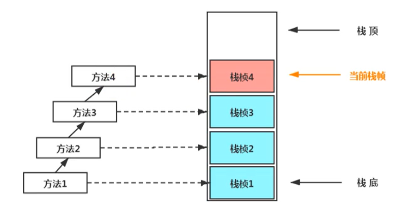 如果在该方法中调用了其他方法,对应的新的栈帧会被创建出来,放在栈的顶端,成为新的当前帧。