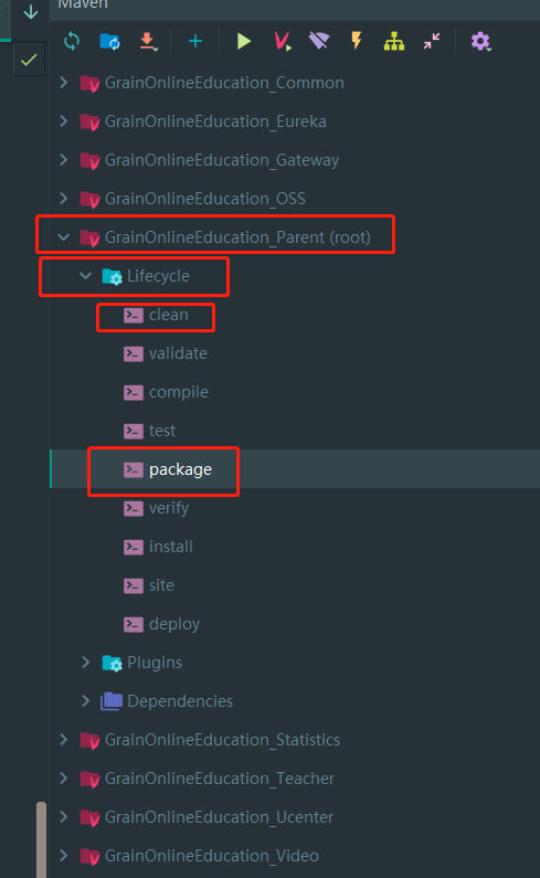 找到我们的父工程,也就是标识了root的。打开lifecycle。先选择clean,再点击package。这样就完成了打包了。