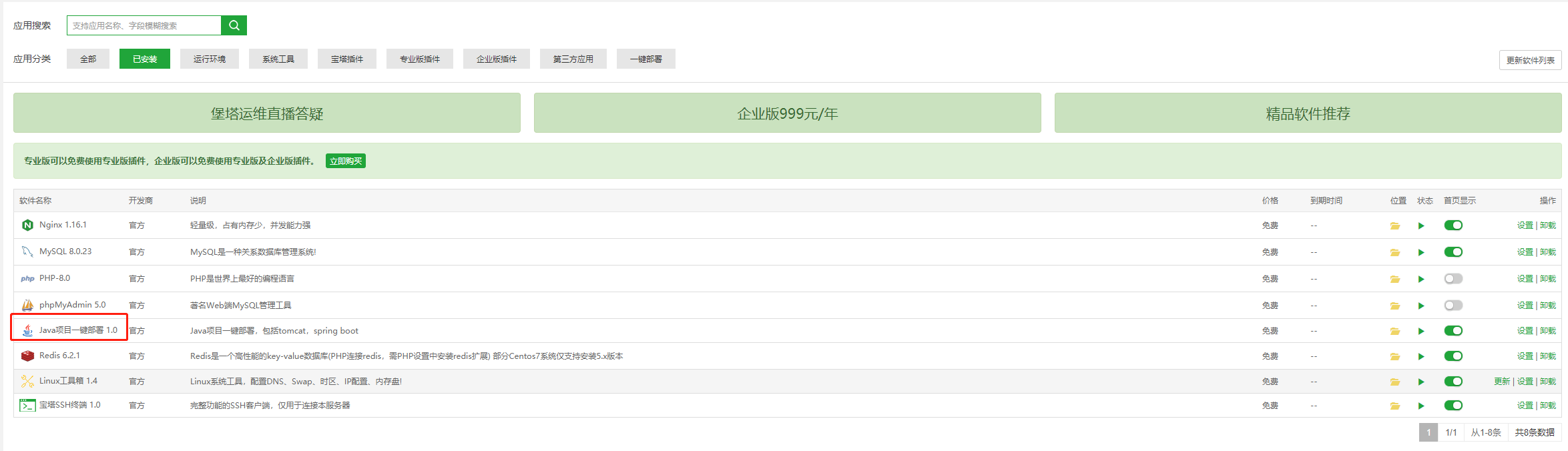 之后来到应用市场,安装java项目一键部署。