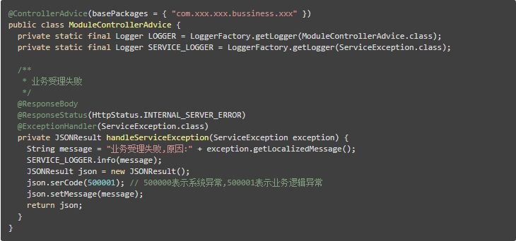 如此一来,我们只需要全局统一处理下 ServiceException 就可以了,很好,spring为我们提供了ControllerAdvice机制,有关ControllerAdvice,可以查阅springMVC使用文档,下面是一个简单的示例: