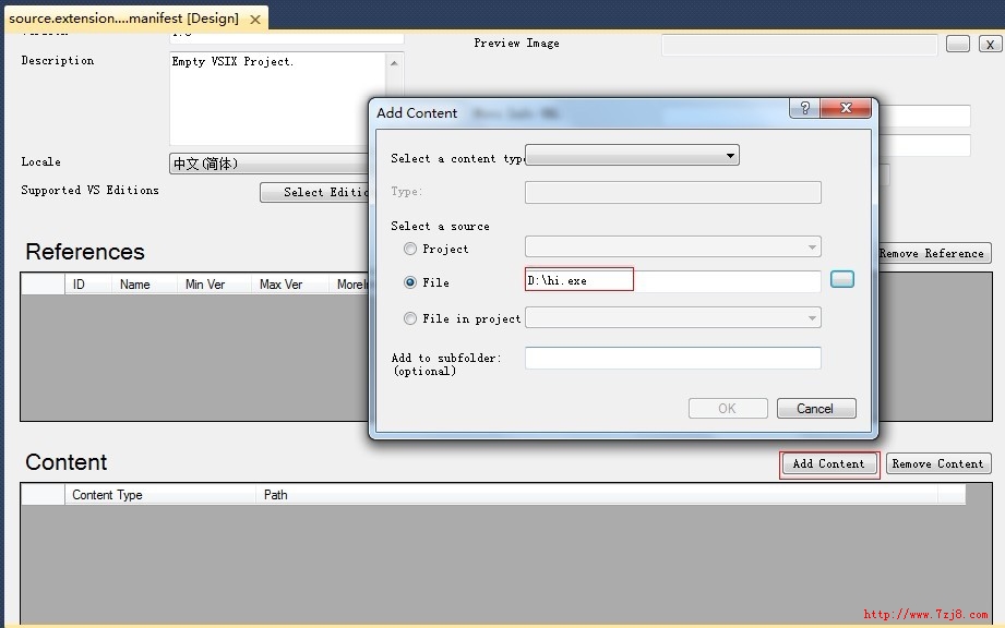 点击创建VSIX Project项目,然后进行相应的配置,选择添加扩展的类型,路径,以及发布版本,如下图所示:
