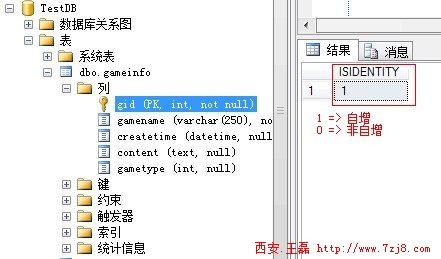IF EXISTS(SELECT TOP 1 1 FROM SYSCOLUMNS SC WHERE SC.ID = (SELECT ID FROM DBO.SYSOBJECTS WHERE DBO.SYSOBJECTS.XTYPE = 'U' AND NAME='表名') AND COLUMNPROPERTY(SC.ID, SC.NAME, 'ISIDENTITY') = 1) SELECT 1 as 'ISIDENTITY' ELSE SELECT 0 as 'ISIDENTITY'