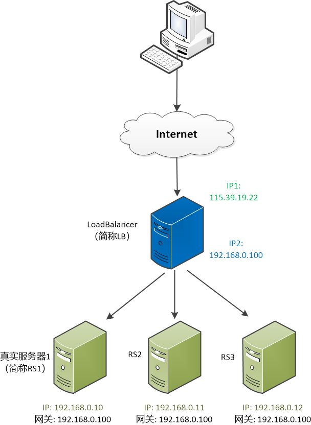 Load Balancer 简称LB , 有两个IP,一个对外(115.39.19.22),一个对内(192.168.0.100)。用户看到的是那个对外的IP。 后面的真正提供服务的服务器有三个,称为RS1, RS2,RS3, 他们的网关都指向LB。
