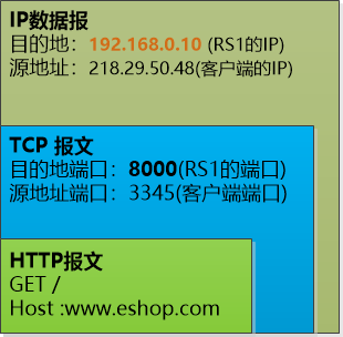 既然Load Balancer得到了这个IP数据包, 它就可以用某个策略从RS1, RS2,RS3中选取一个服务器,例如RS1(192.168.0.10),把IP数据报原封不动, 封装成数据链路层的包(目的地是RS1的MAC地址),直接转发就可以了。