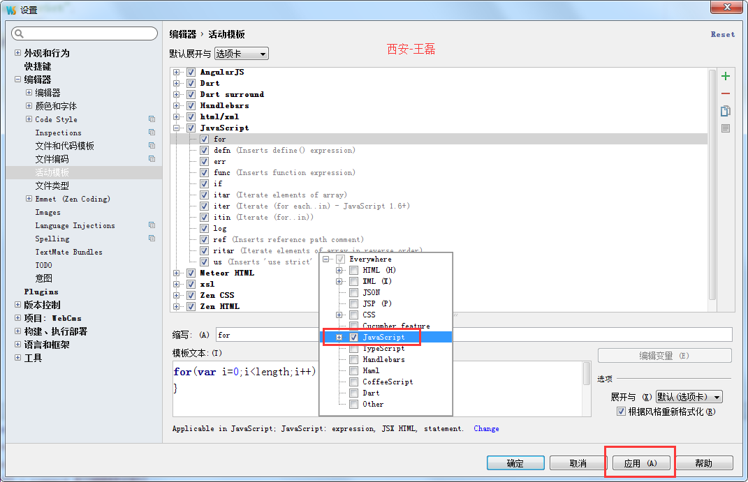 2、找到如下模板,点击右边的“+”号添加Live Template设置关键字和代码,选择底下的Define选择JavaScript点击确定,即可;如图: