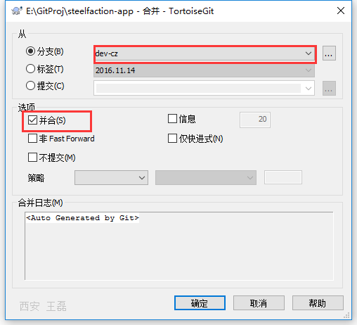 分支开发的代码先推送到远端,切换本地分支到master主分支,项目文件夹右键合并分支,选择你要合并到master的分支,沟中下面的合并按钮,如图: