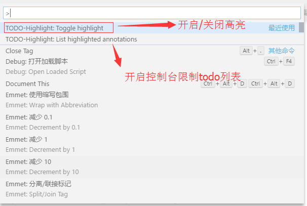 扩展:todo highlight插件使用,开启控制台展示todo list列表,Windows系统按快捷键F1,打开设置面板点击如图开启窗口todo list 展示,如图: