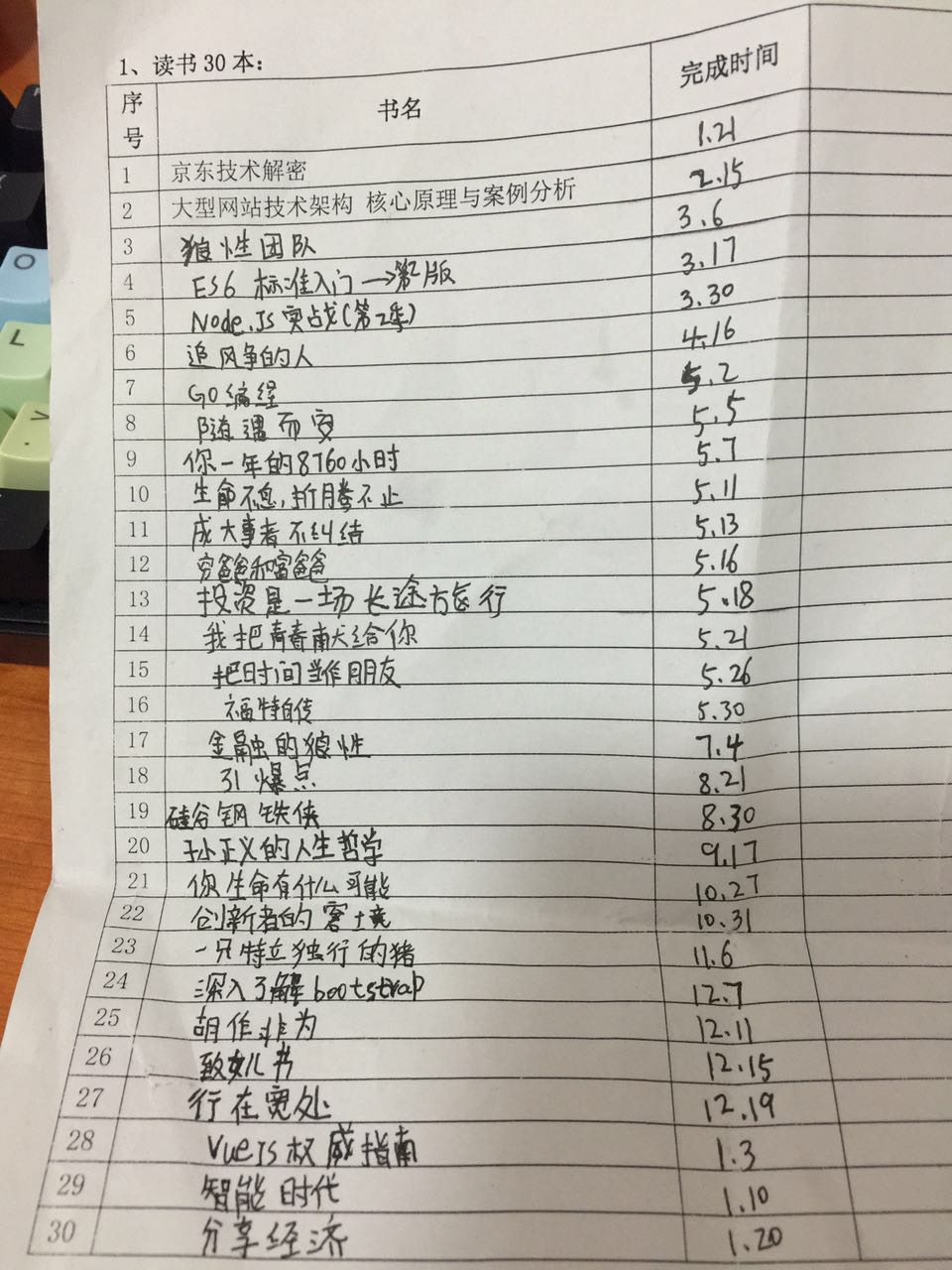 差强人意的完成了去年订的任务吧,如果没有去年的目标,我可能连一半都完成不了吧。今年共计读书30本: