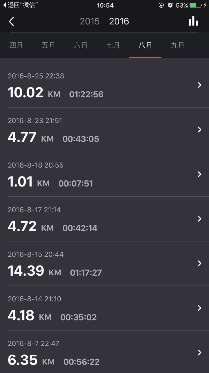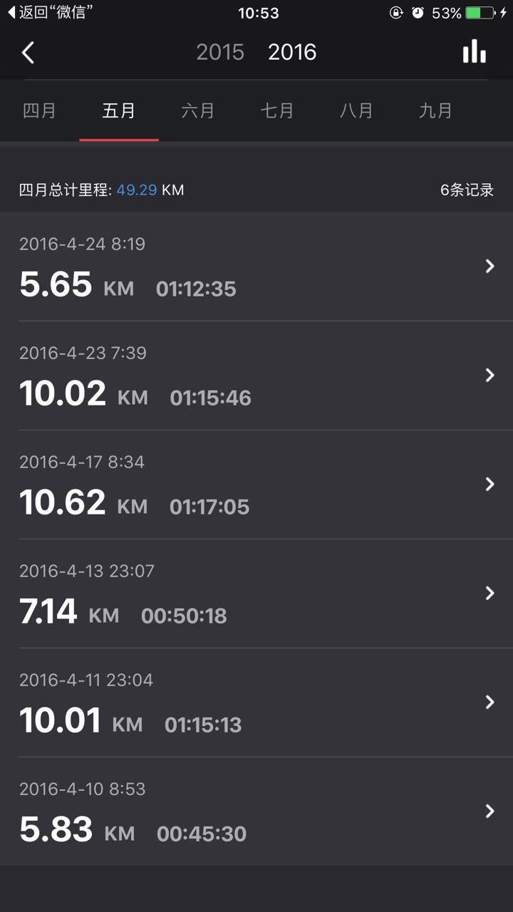 2015年开始跑步,最疯狂的时候是去杭州那会出差,也基本是坚持每天跑步,2016年冬天之前也一直在跑步,没有2015年那么多了,进入冬天之后,雾霾太严重就没有跑了,来年2017年继续。