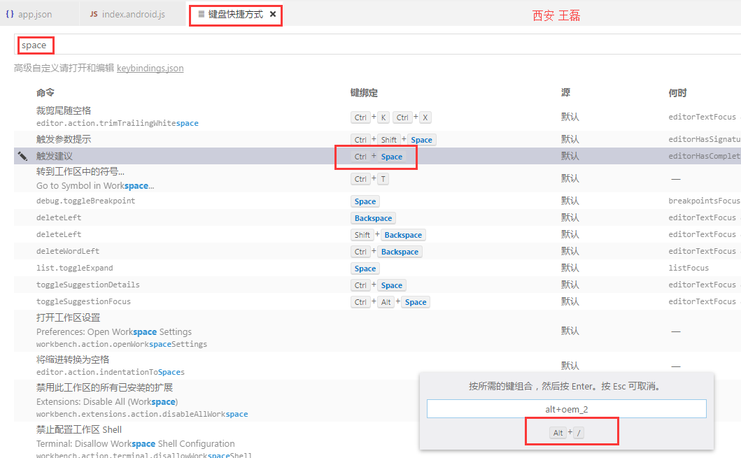 Ctrl + Space:代码提示,与输入快捷键冲突所有使用不了,可根据自己喜爱自行设置,设置:文件 => 首选项 => 键盘快捷方式 => 搜索“space”=>修改为自己的快捷键,如图: