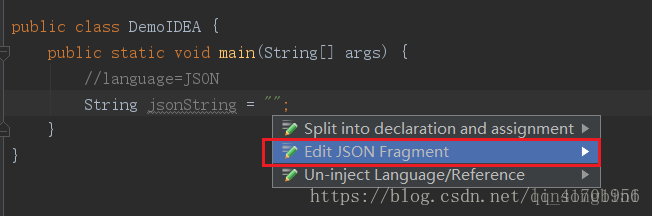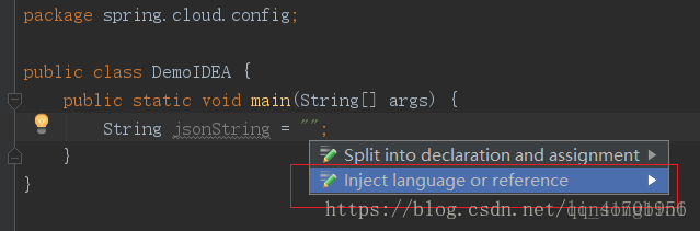 先将焦点定位到双引号里面,使用alt+enter快捷键弹出inject language视图,并选中 Inject language or reference。