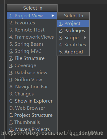 可以先使用alt+F1,弹出Select in视图,然后选择Project View中的Project,回车,就可以立刻定位到类的位置了。