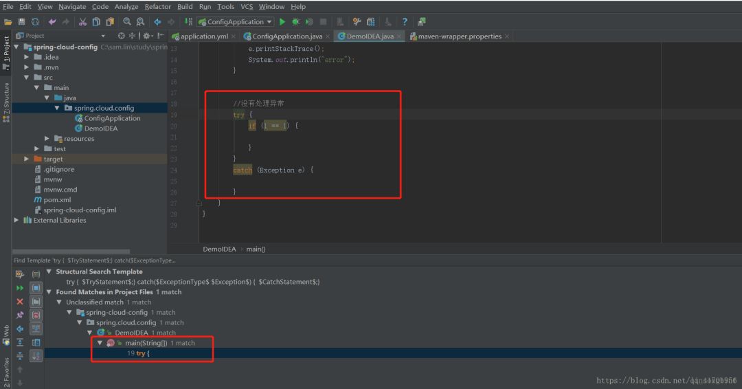 想在整个工程里面找到所有的try catch语句,但是catch语句里面没有做异常处理的。