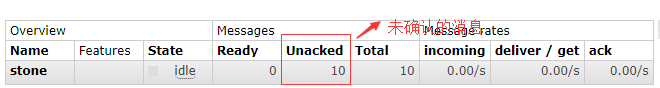 如果应用程序接收了消息,因为bug忘记确认接收的话,消息在队列的状态会从“Ready”变为“Unacked”,如图: