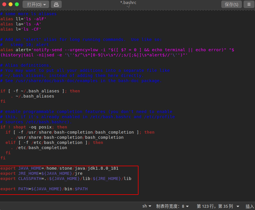 export PATH=${JAVA_HOME}/bin:$PATH 注意: 其中“home/stone/java/jdk1.8.0_181”为我自己存放的JDK目录,用户需要改为自己的存放目录。