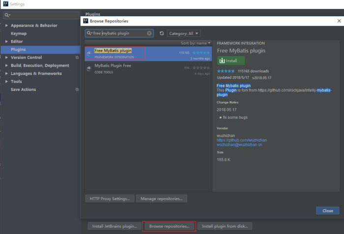 - 输入“Free MyBatis plugin”查找插件