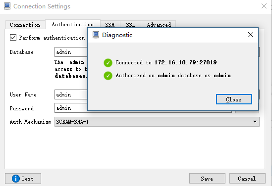 创建的用户名为“admin”密码为“admin”,指定的数据库为“admin”。