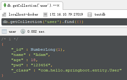 到此为止已经完成了MongoDB的集成,启动项目,输入“http://localhost:8080/”去数据库查看插入的数据吧。