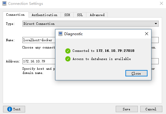 容器装载成功之后,就可以使用Robo 3T客户端进行连接了,是不需要输入用户名和密码的,如下图: