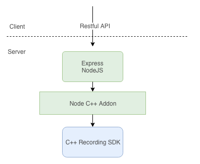服务器的录制程序可以使用NodeJS来实现,这对于开发者来说也是一件好事,毕竟减低了程序部署的门槛,它实现的原理是使用:NodeJS的Express框架来实现Restful API的调用,NodeJS在调用C++的插件,通过插件再调用C++的录制SDK,完成整个流程的,如下图所示: