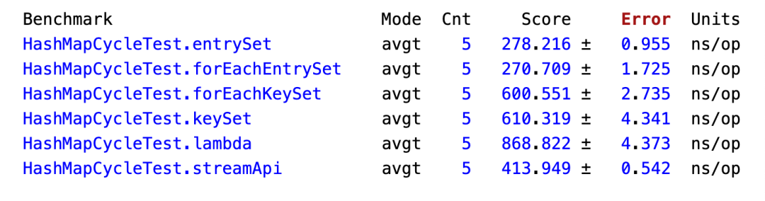 但是不写不知道,一写吓一跳,删除了打印信息的代码之后,惊奇的发现,之前得出的“EntrySet 和 KeySet 性能相近”的结论是错误的,并且我也把 JMH 测试吞吐量的代码换成了平均执行时间,因为这样看起来更直观。而测试的结果是,EntrySet 和 KeySet 的性能相差在一倍以上,详见下文。