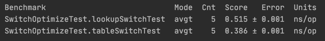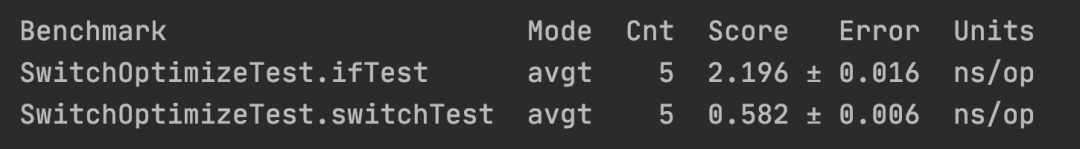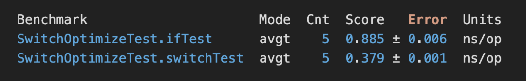 从以上结果可以看出(Score 列),switch 的平均执行完成时间比 if 的平均执行完成时间快了约 2.33 倍。