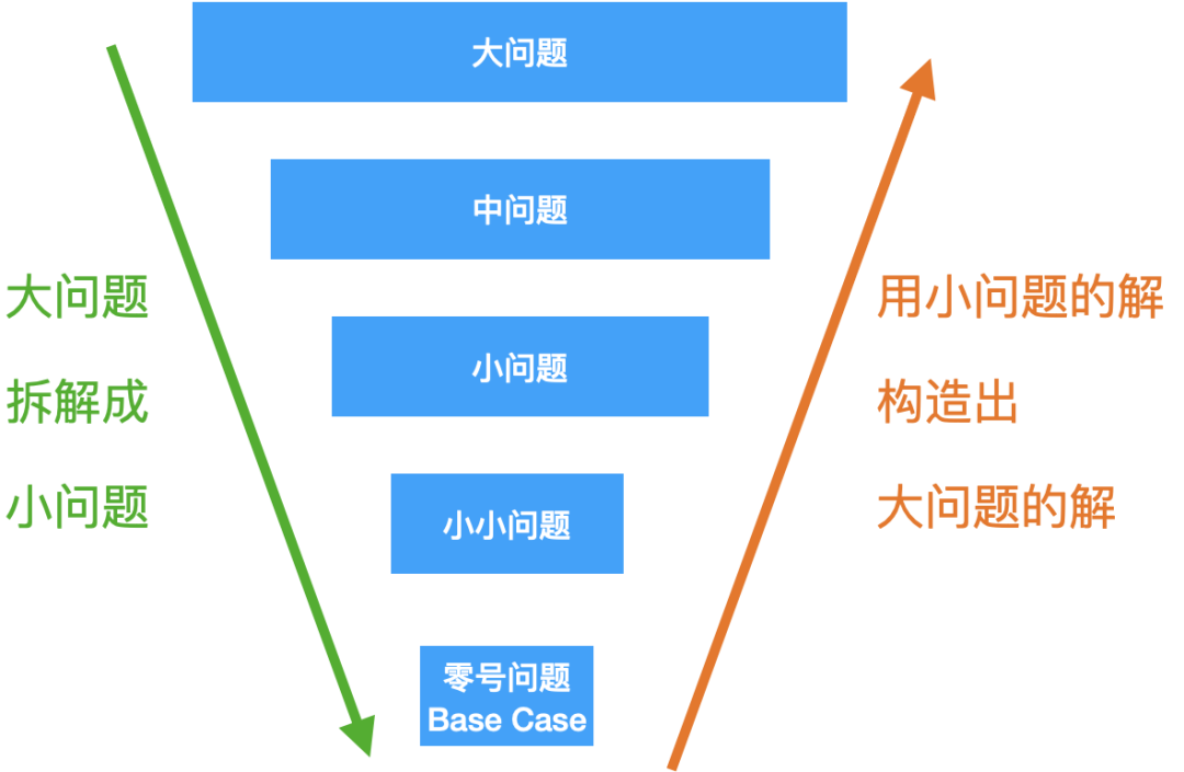 Recursion 是从大到小,层层分解,直到 base case 分解不了了再组合返回上去;