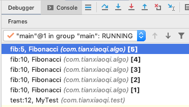 我们在 IDE 里 debug 就可以看到栈里面的情况:这里确实是先走的最左边这条线路,一共有 5 层,然后再一层层往上返回。