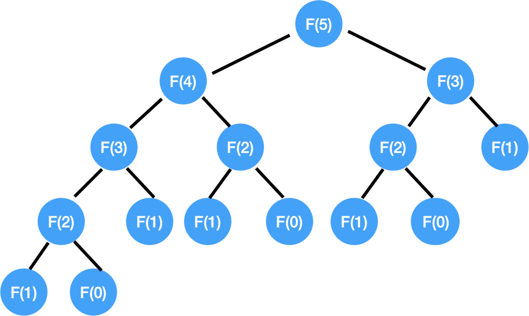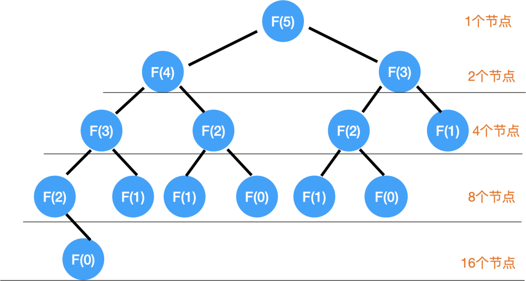 首先我们把这颗 Recursion Tree 画出来,比如我们把 F(5) 的递归树画出来: