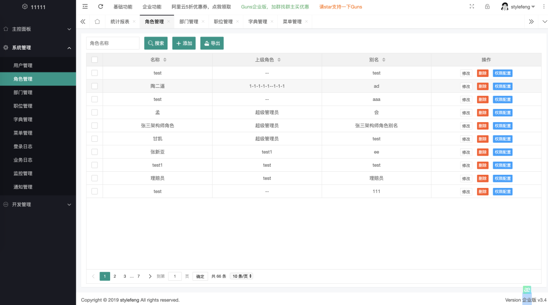 用户管理和权限权利模块做的非常好,满足绝大部分人员管理场景的需求。权限控制采用 RBAC(Role-Based Access Control,基于角色的访问控制) ,支持菜单动态路由。