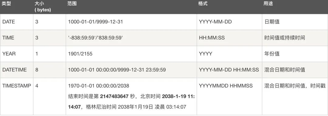 日期类型:Date、DateTime、TimeStamp、Time、Year
