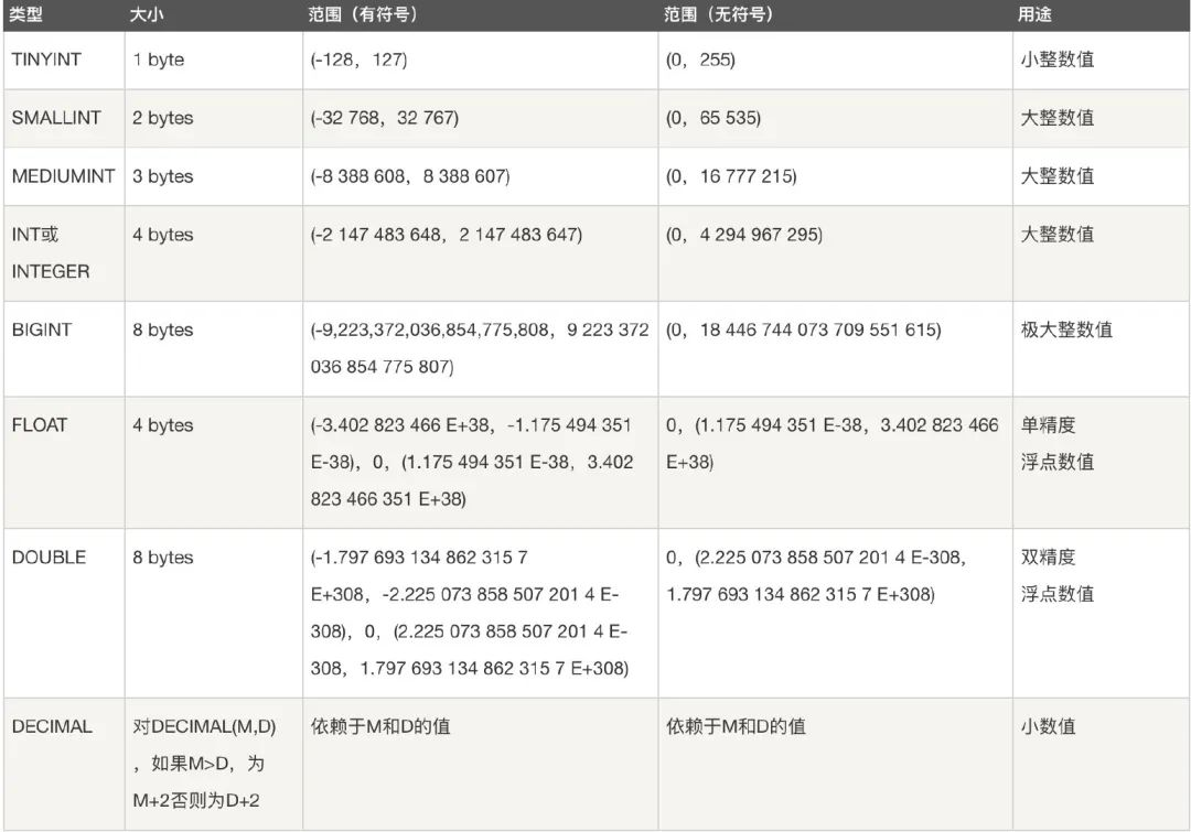 整数类型:BIT、BOOL、TINY INT、SMALL INT、MEDIUM INT、 INT、 BIG INT