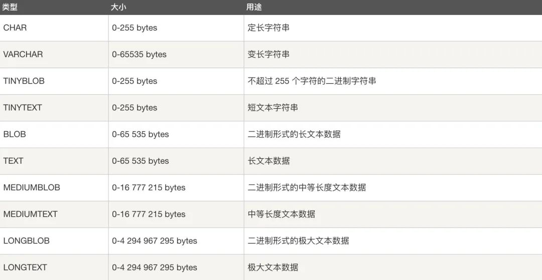 字符串类型:CHAR、VARCHAR、TINY TEXT、TEXT、MEDIUM TEXT、LONGTEXT、TINY BLOB、BLOB、MEDIUM BLOB、LONG BLOB