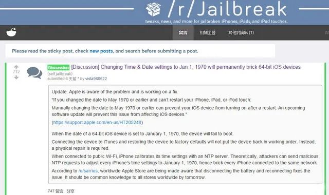 应该很多人都记得《苹果"1970 事件"》,在几年前,一个名为vista980622的网友在国外网站Reddit的论坛上发表了一篇“把iPhone时间改成1970年1月1日,手机即可永远变砖”的帖子。