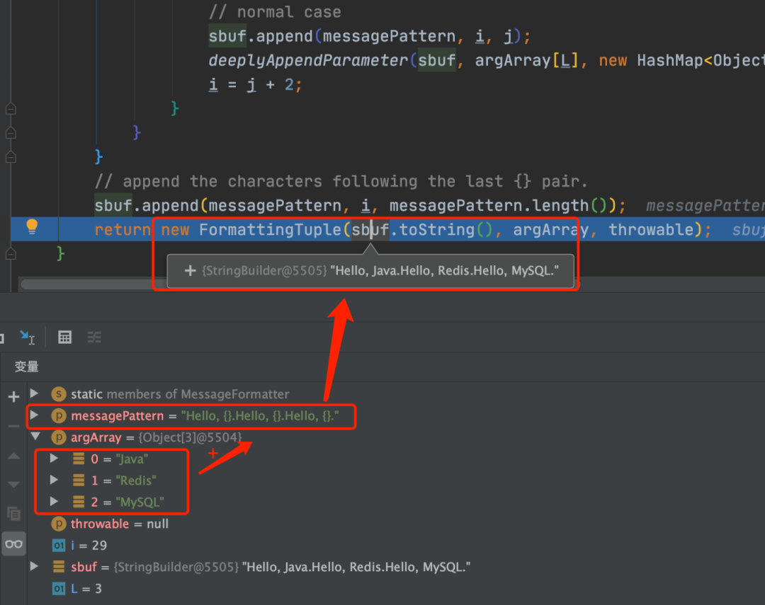 return new FormattingTuple(sbuf.toString(), argArray, throwable);