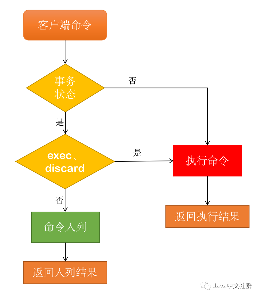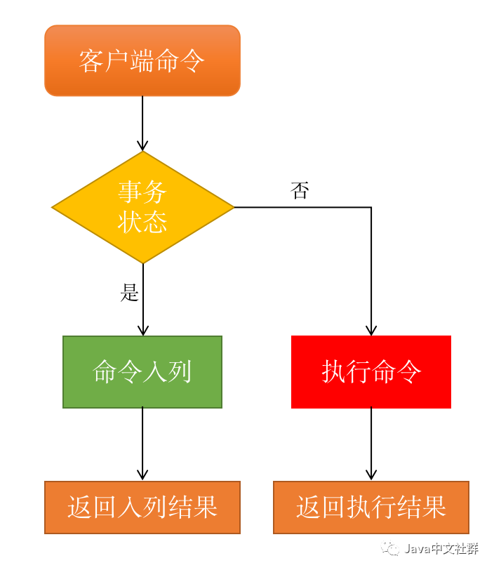 multi 命令可以让客户端从非事务模式状态,变为事务模式状态,如下图所示:
