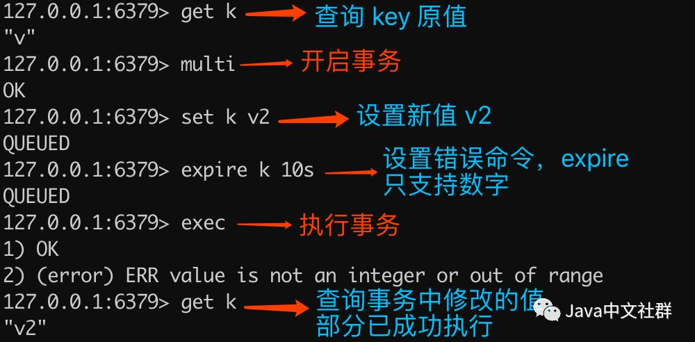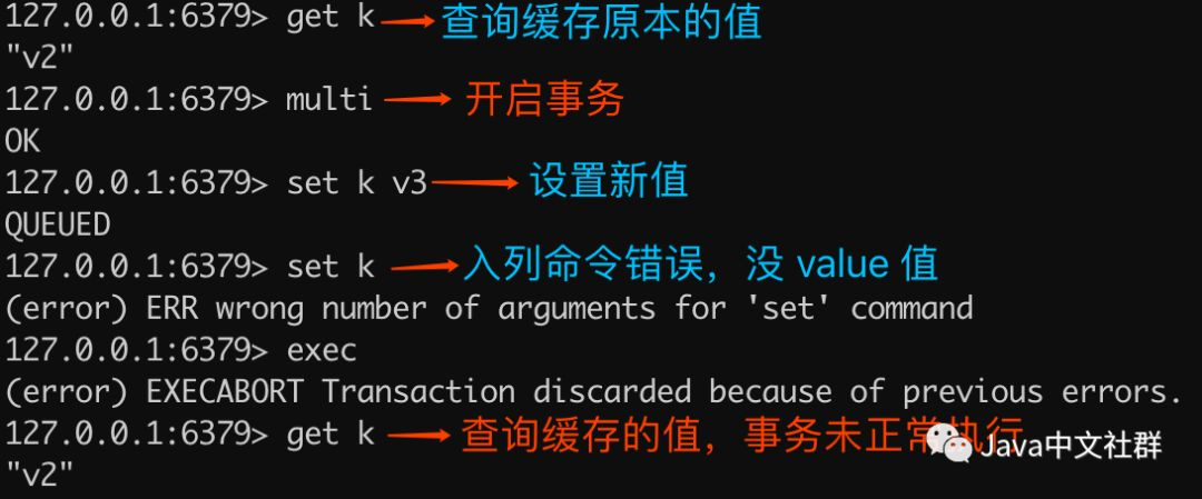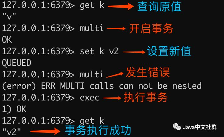 可以看出,重复执行 multi 会导致入列错误,但不会终止事务,最终查询的结果是事务执行成功了。除了重复执行 multi 命令,还有在事务状态下执行 watch 也是同样的效果,下文会详细讲解关于 watch 的内容。
